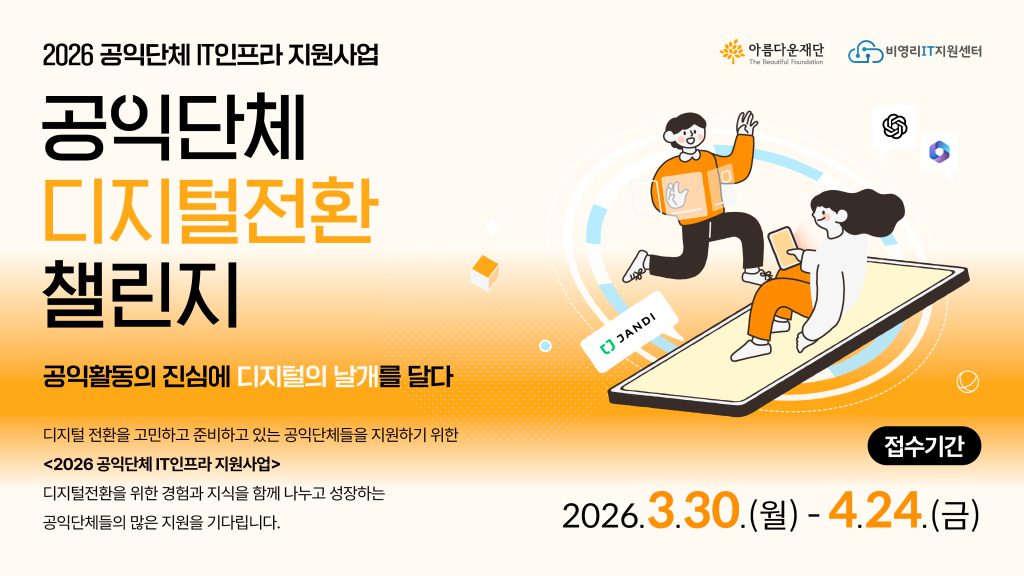 📢 2026 공익단체 IT인프라 지원사업 설명회(온라인) 일시 : 2026년 4월 8일(수) 14:00 ~ 15:00 (1시간) |